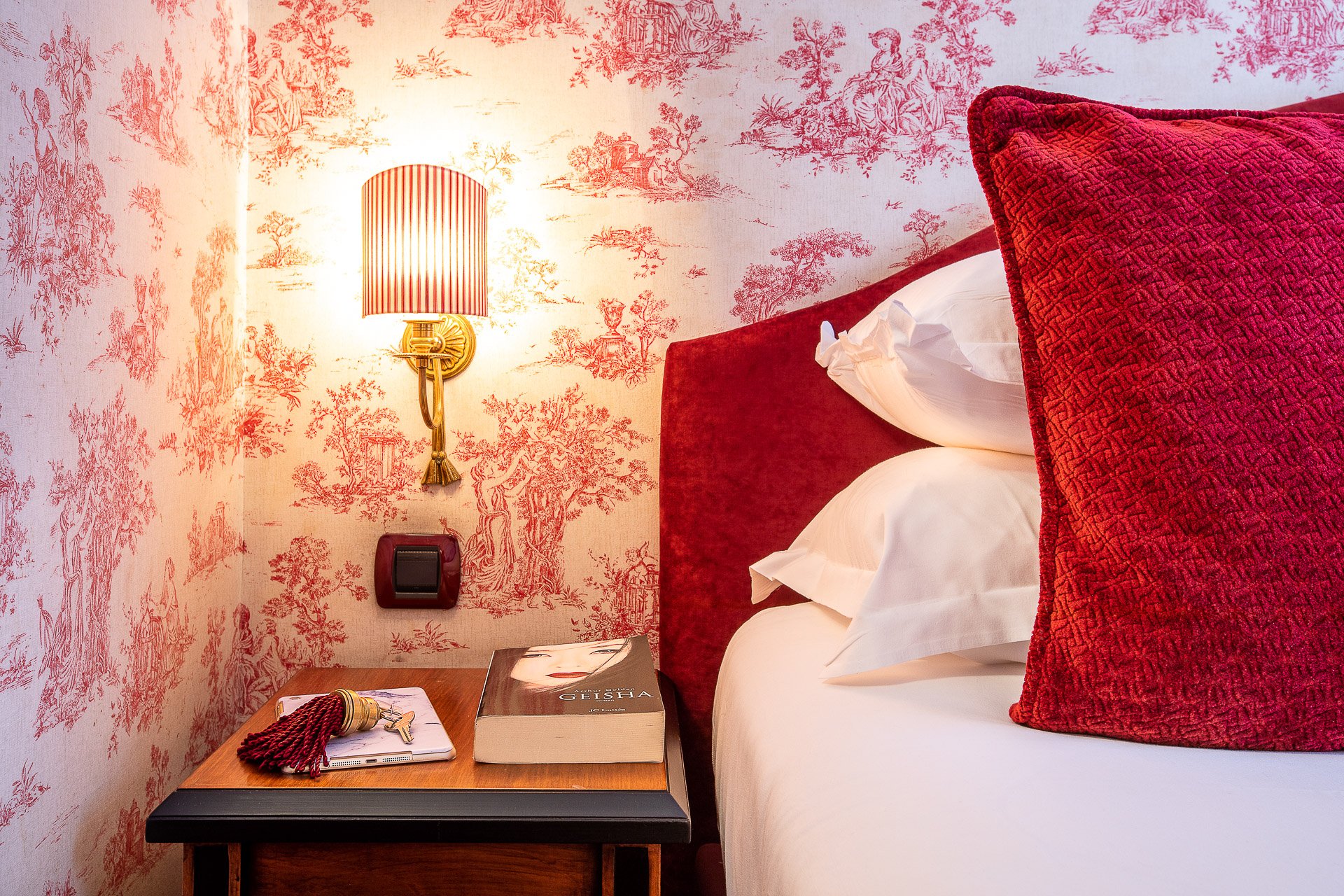 欧仁尼之家41间客房的装饰让人想起拿破仑三世时代的辉煌和庄严以及欧仁尼-德-蒙蒂霍皇后的奢华。覆盖在墙壁上的皇家Jouy和桃花心木图案,让你立刻被舒适和优雅所笼罩。